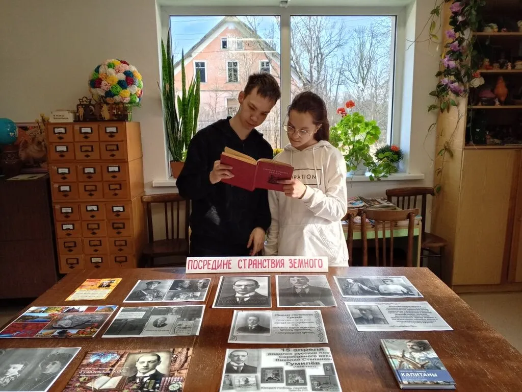 поэта Серебряного века Николая Степановича Гумилева- одного из ярчайших фигур русской поэзии.Была оформлена книжная выставка:" Посредине странствия земного". Присутствующие познакомились с жизнью и творчеством замечательного поэта. Его стихи, насыщенные экзотикой, мужеством и романтикой, до сих пор вдохновляют и восхищают. Николай Гумилев- это не просто поэт, это искатель неведомого счастья, который через свои стихи открывал новые миры и делился своими открытиями с нами. На вечере прозвучали стихи:" Жираф", " Память", " Перчатка" и др. Творчество Николая Степановича вызывает живой интерес , приятно осознавать, что поэзия этого великого поэта продолжает звучать современно и побуждает к размышлениям.