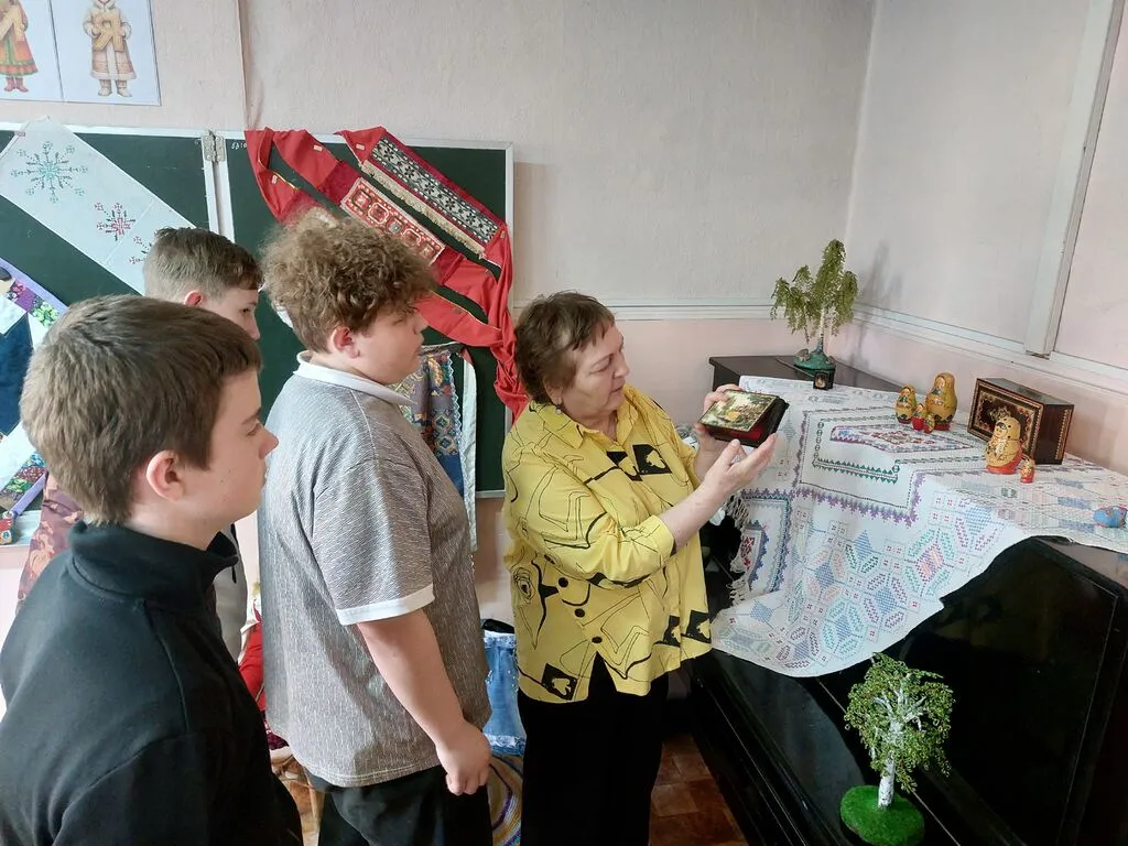 Заведующая отделом музея посёлка Неманское Комарова Н. В. представила выставку декоративно-прикладного искусства. Рассказала о Мезенской росписи народов Архангельской области.